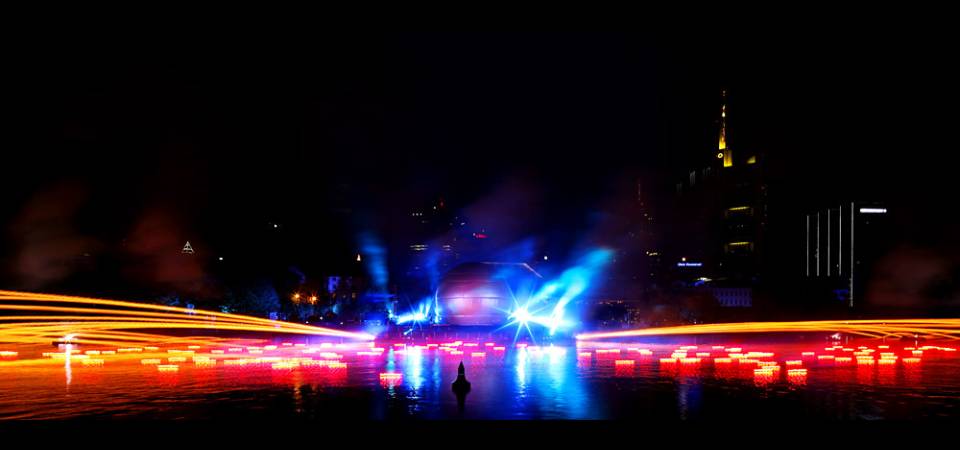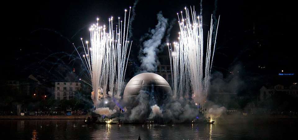 Mittelpunkt des 30-minütigen Events: eine 14 Meter hohe schwimmende Bühne in Form eines überdimensionalen Fußballs. Als Projektionen richteten Frankfurter Nationalspielerinnen Botschaften aus dem Ball, der sich zur Erdkugel wandelte, an die Fans.
